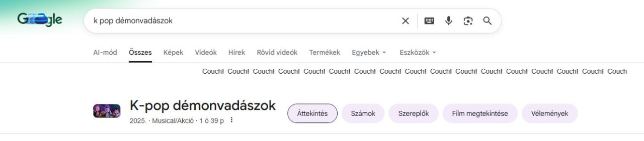 A jópofa utalás előcsalogatásához mindössze annyit kell tenni, hogy beírjuk a keresőbe, hogy K-pop démonvadászok, de próbálkozhatunk az angol verzióval, azaz a KPop Demon Hunters címmel is, azzal is működni fog a dolog. Ha ez megtörtént, a találati oldal tetején egy mozgó, szöveges sávra lehetünk figyelmesek, ami úgy szól: „Couch! Couch! Couch!”.
