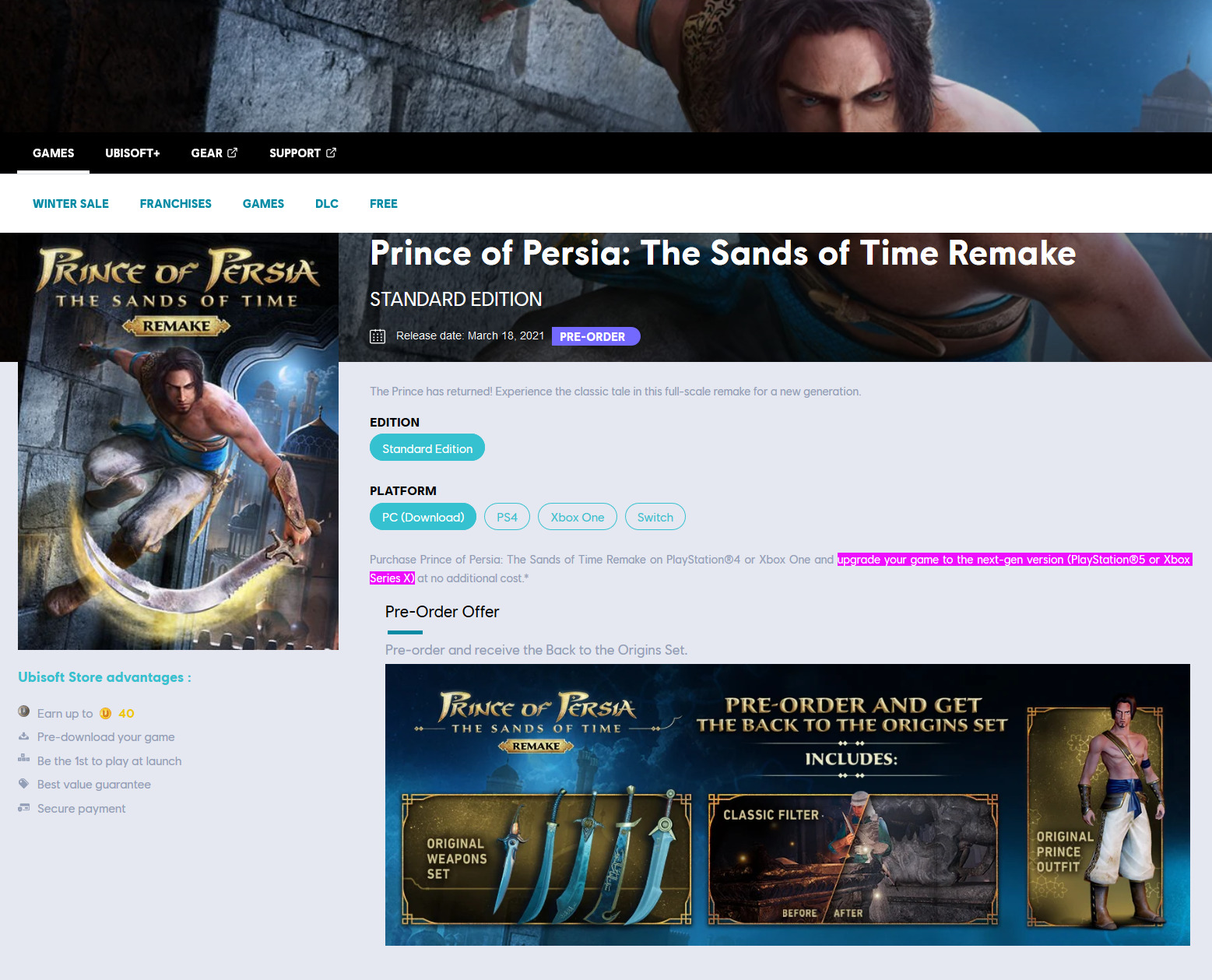 Már korábban is voltak arra utaló jelek, hogy Switch-re is megjelenhet a Prince of Persia: The Sands of Time remake-je, most pedig többé-kevésbé hivatalos megerősítést is kaptunk erről, a Ubisoft digitális áruházában ugyanis a Nintendo konzoljára is előrendelhető a játék.
