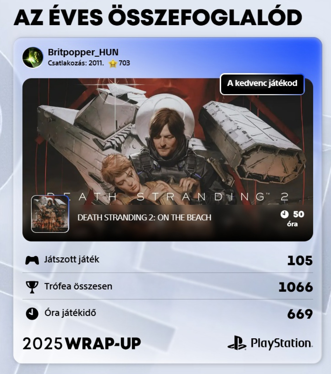 Ahogy év végén szokás, ezúttal is nagyban pörögnek a Wrap-Up összefoglalók. A Spotify épp néhány napja adta ki a sajátját, most pedig megjött a PlayStation is, hogy megmutassa, melyik játékokkal töltöttük el a drága szabadidőnket 2025-ben. Hogy ne nekünk kelljen ezzel foglalkozni és otthon számolgatni, a PlayStation megcsinálja helyettünk – csak kattintsatok IDE és már meg is leshetitek a saját összefoglalótokat! Ha gondoljátok, dobjátok be nekünk Facebookon a kommentek közé, addig is, én hozom a sajátomat, ami idén így néz ki:
