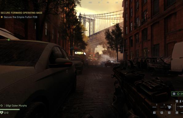Amikor viszont minden klappol, és próbálunk nem odanézni, amikor a társaink bunny hoppolva vagánykodnak a Brooklyn Bridge romjai közt, a Battlefield 6 tud nagyon jó összképet is adni. A nagy, széles látképű jelenetek vagy a fény-árnyék játékkal trükköző szekciók jól festenek, de még az az orbitális húgy-filter sem áll rosszul a játéknak, amitől néhány helyszín sárgább, mintha Unreal Engine 3-ban vették volna fel a Breaking Bad mexikói jeleneteit. Jól áll ez a túlzó hatásvadászat az egyjátékos módnak, de ez semmiképp nem nyers grafikai bravúr.