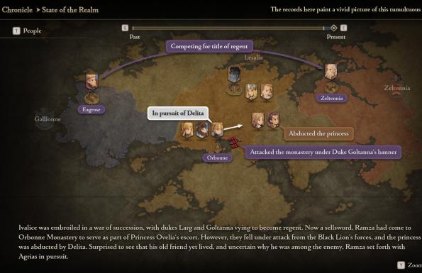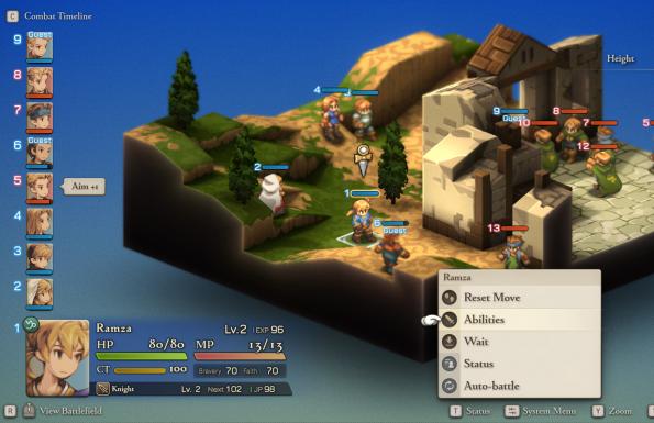 A világépítésében A tűz és jég dalával versenyt futó, a színpadias monológjaival pedig néha Shakespeare-i magaslatokba emelkedő, és a tintával sosem spóroló párbeszédek mellett még egy megújult kódexet is kapunk, ahol a cselekménnyel haladva követhetjük nyomon Ivalice történelmét. Jól látható, hogy a Square Enix legfőbb célja az volt, hogy minél könnyebben befogadható legyen a komplex taktikai szerepjáték, de ez egyáltalán nem jelenti azt, hogy a hírhedt nehézsége bármennyit is tompult volna. Néhány sztoriharc már közepes fokozaton is alaposan felmossa velünk a padlót, ha nem vagyunk hajlandók egy kis extra grindolásra a véletlenszerű csatákon – amiket mostantól gombnyomásra skippelhetünk. Éppen ezért senki ne érezze megalázva magát, ha első körben a Squire új, könnyített módjával kóstol bele a játékba, hiszen ez sem teszi triviálissá az apró diorámákon zajló csatákat. A karakterek permanens halála továbbra is suhintásra kész kardként lebeg a fejünk fölött, ahogy az ellenséges Knight-okat sem fogjuk szívlelni, akik előszeretettel pusztítják el a hőseink viselt felszereléseit.