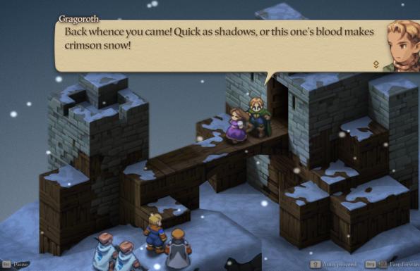 Definitív kiadásnak nem nevezhető az Ivalice Chronicles (erre még visszatérek, hogy miért), de az egészen biztos, hogy ez a Final Fantasy Tactics valaha megjelent legkiválóbb verziója. A kötelező, de az eredeti látványvilág szellemiségéhez hűséges grafikai frissítés mellett egy teljesen átdolgozott kezelőfelületet, áramvonalasított rendszereket és teljes angol, illetve japán szinkront kapunk, amihez még egy jócskán kibővített szövegkönyv is társul. Az ősz hajszálaikat számolgató fanoknak már csupán a kiváló hangalámondás miatt is megéri benevezniük a felújított kiadásra, de megér egy misét az is, ahogy a Square kibővítette és átláthatóbbá tette az eredeti verzió kusza szövegezését, amit az akkori gyenge fordításnak “köszönhettünk”. A szkript a 2007-es PSP-s kiadás újabb fordítását vette alapul, de beszélt szöveghez igazította Ramza Beoulve történetét, aki a nagy nemesi házak politikai játszmái közt tanulja meg a társadalmi egyenlőtlenségek és barátság elvesztésének tragikus leckéit.