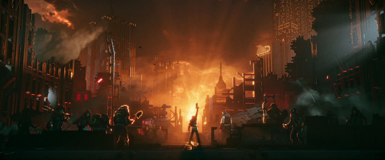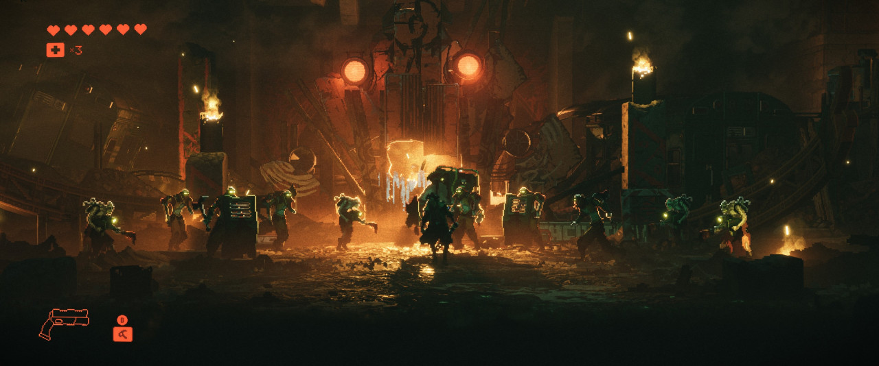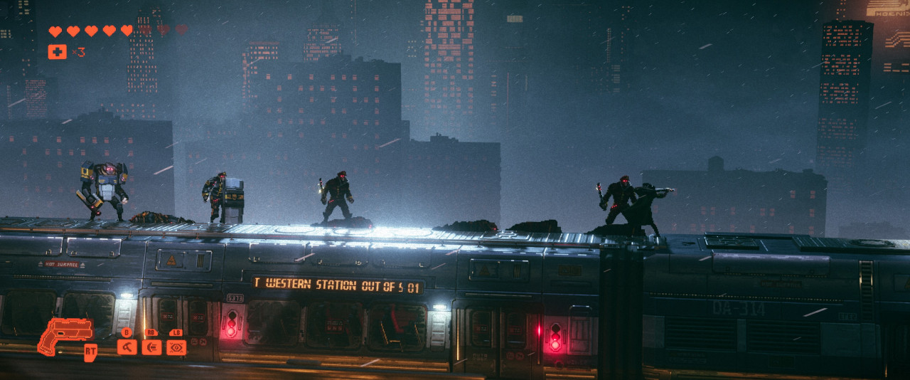 És ha már így szóba került a sokáig csak a távolból szemlélt metropolisz, muszáj szót ejtenem a látványról, hiszen egyértelműen a grafika a Replaced legerősebb pontja – kivéve a fekete sávokat, azokat nem tudtam mire vélni. Már az előzeteseken is látszott, hogy a pixel art stílus ötvözése az olyan modern(ebb) vívmányokkal, mint a dinamikus fény-árnyék hatások, remek döntésnek bizonyult, élőben viszont még szebb az összhatás – percekig csodáltam a tájat, miután volt időm szusszanni a pörgős prológust követően. Sokat hozzátesz az élményhez, hogy az egész kép rendkívül dinamikus – mozog a növényzet, patkányok futkoznak a csöveken, bogarak repkednek a fényforrások körül, ilyesmik –, egyetlenegyszer sem válik unalmassá az elénk táruló pixelrengeteg. Legalábbis technikai szempontból, és akkor most következzék a második fekete pont, melynek beírása nagyban függ attól, mi jut eszedbe a „cyberpunk” szó hallatán. Amennyiben azt várod, hogy egy 2,5D-s Night Cityben verheted péppé a csúnya, gonosz nagyvállalat csatlósait, nagyot fogsz csalódni, mivel a Replaced körülbelül 75-80%-a Phoenix-Cityn kívül játszódik, ráadásul a városba érve sem igazán csodálhatod meg a helyi látványosságokat, hiszen a labor az úti cél, ahol minden elkezdődött.