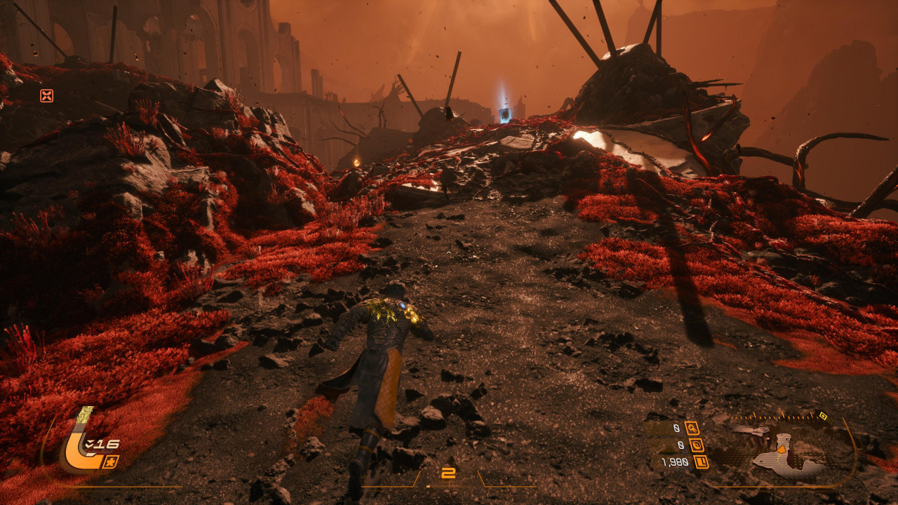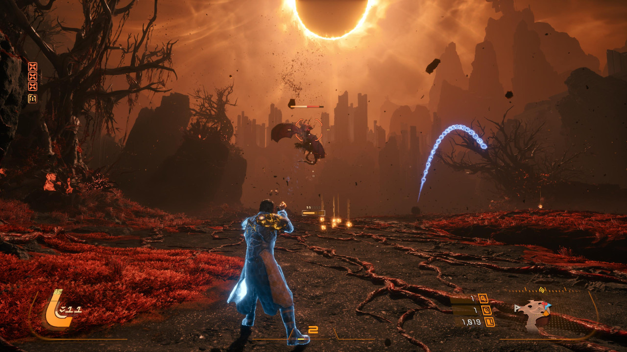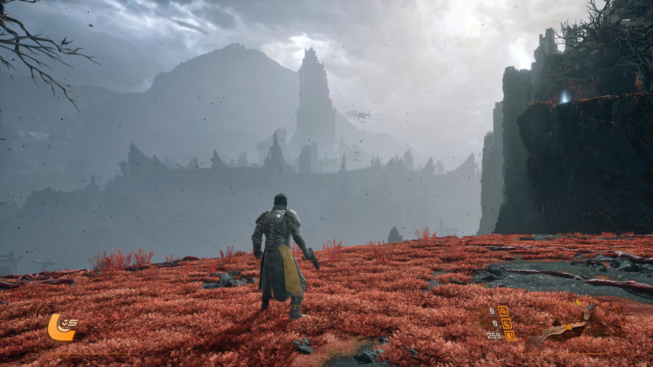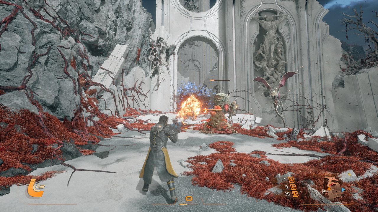 Carcosa tehát nemcsak veszélyes, de képes játszani az ember elméjével is. Ezt szépen ki is használják a sztoriban, hiszen a különféle idegen rémségek mellett Arj múltja is fontos szerepet kap. A játékmenet tekintetében a Housemarque továbbra is hű maradt az intenzív, gyors tempójú harcrendszerhez, amely a stúdió védjegyévé vált, ugyanakkor a SAROS esetében nagyobb hangsúlyt kap az előrehaladás tartóssága. Míg a Returnal egyik kulcseleme az volt, hogy halál után szinte minden elveszett, addig a SAROS bevezeti a Second Chance rendszert, amivel az első halál esetén azonnal vissza tudunk térni és maximumra töltött életerővel tovább darálni – persze ezt a képességet előbb ki kell oldani. Ez a változtatás jelentős hatással lehet a játék ritmusára és hozzáférhetőségére, különösen azok számára, akik a roguelike-műfaj szigorúbb mechanikáit nehéznek találják és emiatt kerülnék el a Housemarque vadonatúj alkotását. Bár a SAROS helyenként piszok nehéz, azért szépen bele lehet rázódni és egy-egy halál után nem érezzük azt, hogy szándékosan kitolt volna velünk a játék.