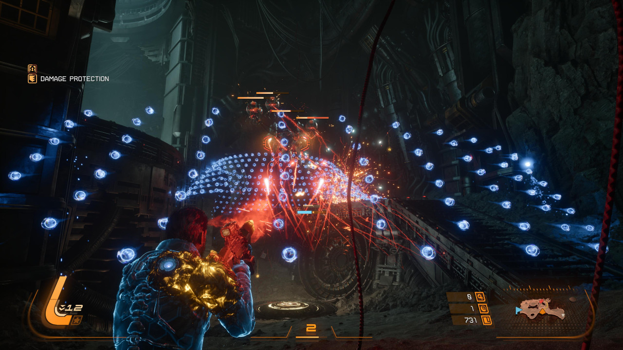 És itt jön be egy fontos játékelem: a halál. Mert bizony meg fogtok halni, nem is egyszer, és ezt nem lehet elkerülni. A SAROS koncepciójának része a játékos halála, ilyenkor pedig automatikusan visszakerülünk az Echelon IV bázisára, ahol a többiek már várnak ránk. Minden egyes visszatéréskor (vagy újraéledéskor, nevezzük akárhogy), a játék kijelzi, hogy mennyi ideig voltunk életben az adott nekifutás alkalmával, és ez bizony lehet 40, de akár mindössze 10 perc is. Ahogy haladunk előre, úgy találunk egyre erősebb fegyvereket és spéci módosítókat, amik megkönnyítik az életben maradást és a harcokat, de még ezek sem garantálják, hogy egyszerre 6-7 keményebb ellenfél, vagy egy főboss ne csinálna ki másodpercek alatt. Tudunk dashelni és pajzsot magunk köré vonni, ezeket pedig a lövöldözéssel kombinálva komplett harci balettet nyomhatunk le.