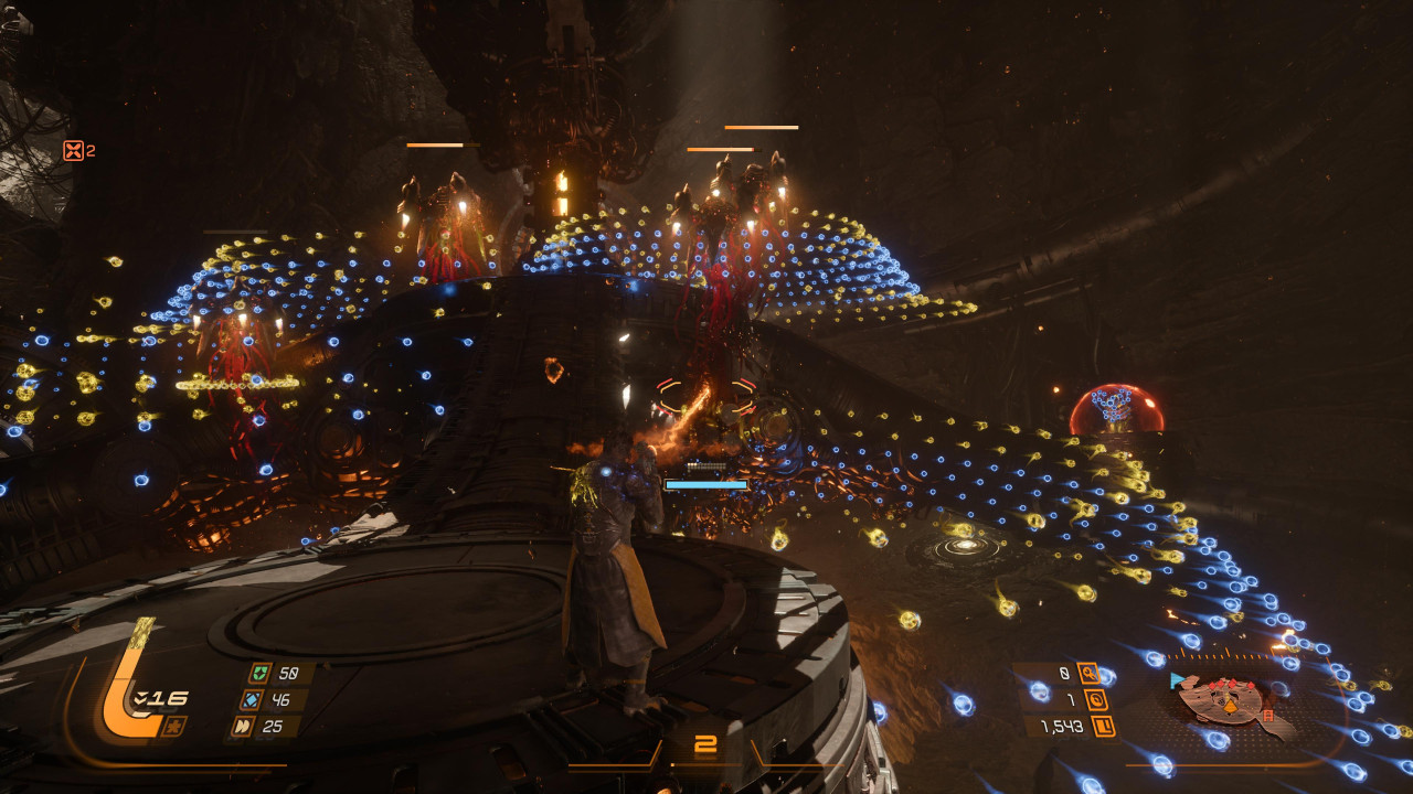 Nem szeretném kerülgetni a forró kását, ez a játék bizony nehéz. Erről nem érdemes vitát nyitni, a SAROS nehéz és ennyi – el kell fogadni. Bele lehet jönni, hozzá lehet idomulni a heves harcokhoz és a lézer-záporhoz, a későbbi pályákon több ellenfélnél már konkrétan diszkófényeket megszégyenítő módon kavarognak a képernyőn a kék, sárga, és piros effektek, de a halál ebben a játékban alapvető mechanika. Akármilyen ügyes is az ember, előbb-utóbb eljut egy olyan helyre, ahol vagy a több ellenfél, vagy egy főboss iktatja ki. A pályák elég érdekesen épülnek fel, hiszen féltávon mindig akad egy furcsa oltár, amit megérintve bekövetkezik a napfogyatkozás és megváltozik a környezet.. Élőbb, organikusabb lesz, eleinte például csápok kezdenek tekeregni, és itt sokkal jobb módosítókat, illetve erősebb fegyvereket is összeszedhetünk, ugyanakkor a kockázat is nagyobb. Minden egyes újabb világ (ezeket a központi bázisról tudjuk elérni és megnyitni) egy erős főellenféllel zárul. Ezeknél elég rendesen kitettek magukért a Housemarque fejlesztői: bitang jól kinéző bossfightokat lehet lenyomni. Külön érdekesség, hogy az első világ Lovecraft-hatásait később H. R. Giger (Alien) munkáit idéző miliő váltja el, ami nekem behozott egy kis Scorn hangulatot. A képi világ elképesztő, tényleg mocsok jól néznek ki az egyes belső terek, és szépen idézik vissza a weird-fiction műfaját. Ha valaki rajong a Cthulhu-mítoszért, az elborultabb sci-fi könyvekért, vagy épp az Alien-filmekért, akkor itt otthonosan fogja érezni magát.